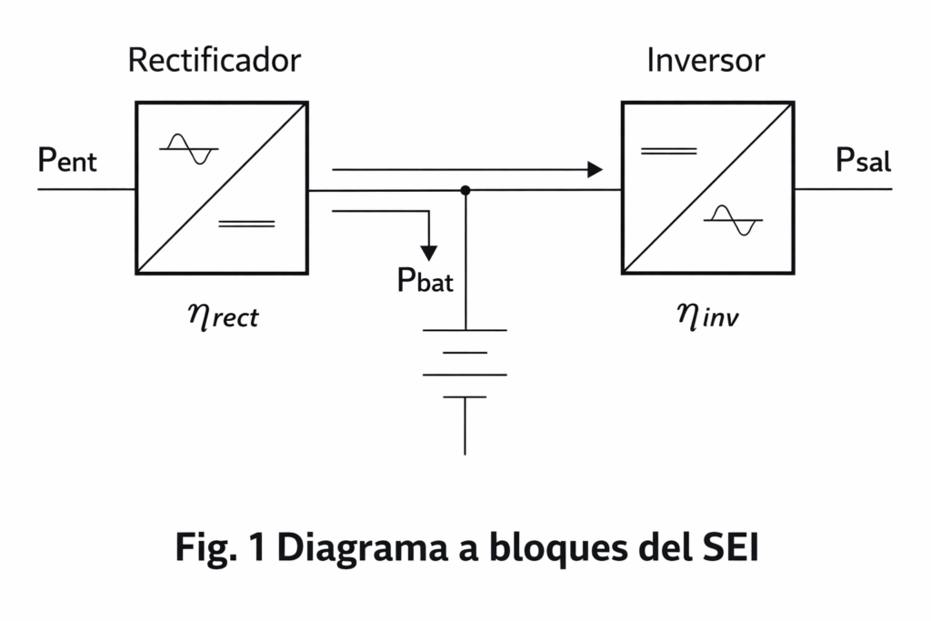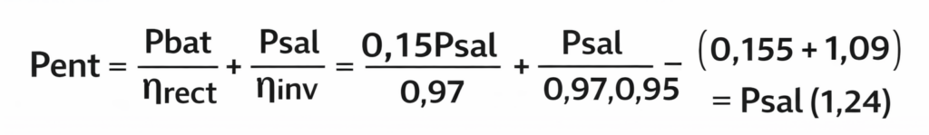 | Psal = Potencia de salida máxima (W) Pbat = Potencia de recarga máxima de batería (aprox. 15% de Psal) Ŋinv = Eficiencia del inversor = 0,95 Ŋrect = Eficiencia del rectificador = 0,97 Pent = Potencia de entrada |