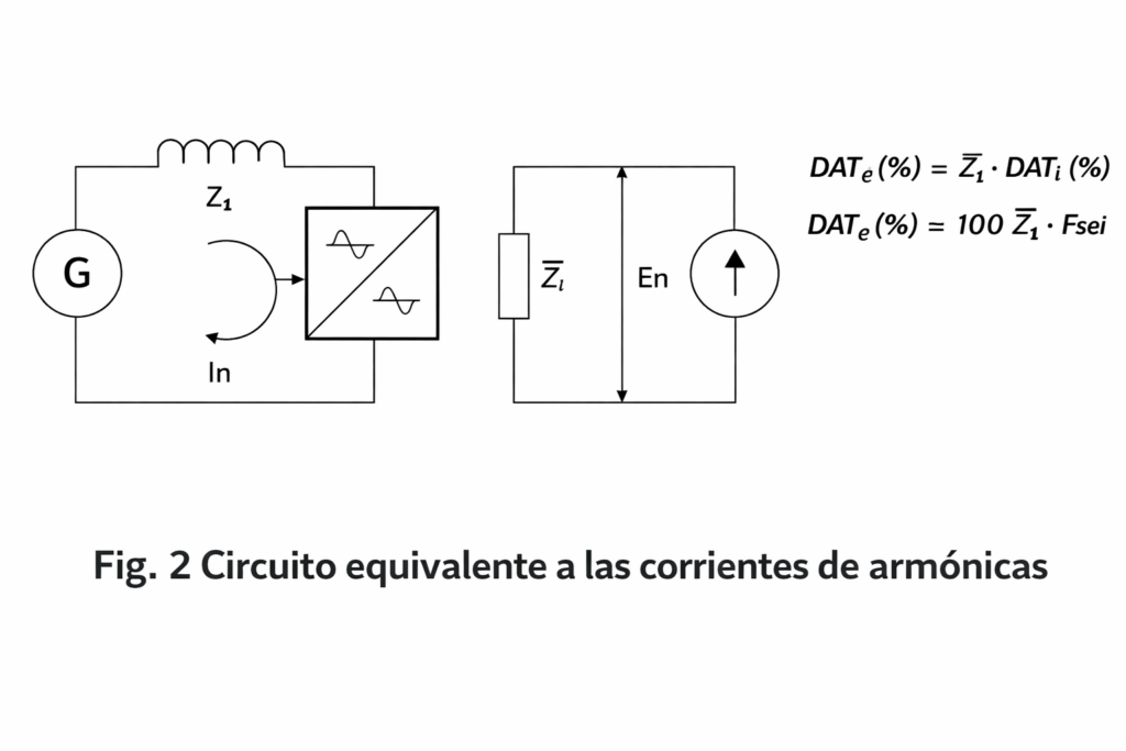 2. Establecer la capacidad mínima de la planta de emergencia. Se debe usar como referencia la impedancia subarmónica del generador propuesto y la distorsión armónica total máxima de tensión tolerable del generador (típicamente entre el 5% y el 8%), como resultado de la distorsión armónica normalizada de la corriente generada por el rectificador que utiliza el UPS en cuestión. Ver la figura 2.
