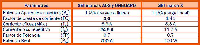 En la tabla anterior se aprecia que los UPS marca AQS y ONGUARD son adecuados para esta aplicación. Por el contrario, del equipo marca X se requiere una capacidad mínima de 1,8 kVA para manejar las corrientes pico que demanda el servidor, ya que en este caso se trata de una carga no lineal cuyo factor de cresta es mayor a 1,41: