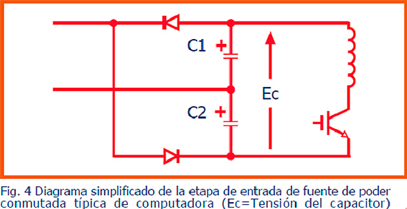 La forma de onda de corriente se genera al recargar el capacitor electrolítico de entrada en cada semiciclo en la cresta de la onda de tensión. Ver Fig. 4